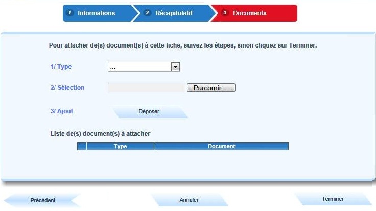 Pour attacher des documents à cette fiche, suivre les étapes A, B, C, puis cliquer sur "Terminer" |