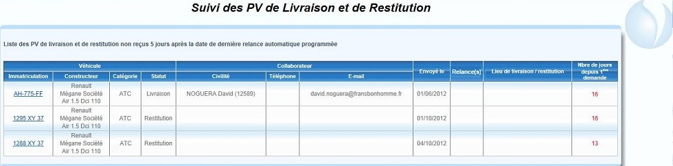 Liste des PV de livraison ou PV de restitution non reçus 5 jours après la date de dernière relance automatique programmée