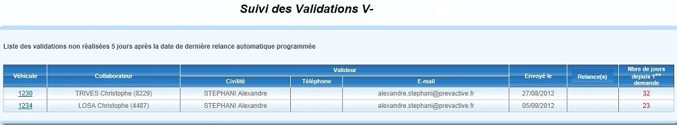 Liste des validations non réalisées 5 jours après la date de dernière relance automatique programmée