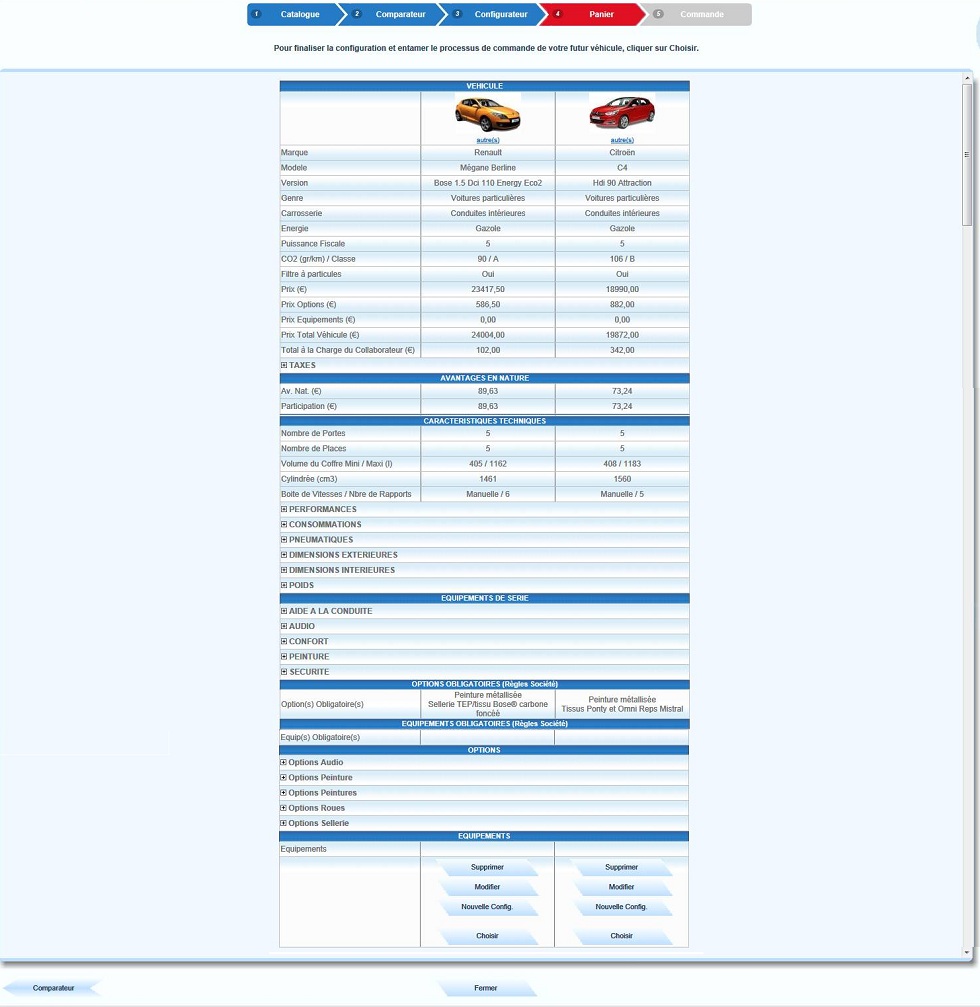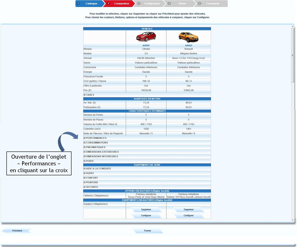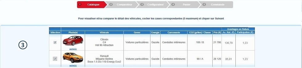 Dans la colonne "sélection", activer les coches correspondantes aux véhicules à comparer |